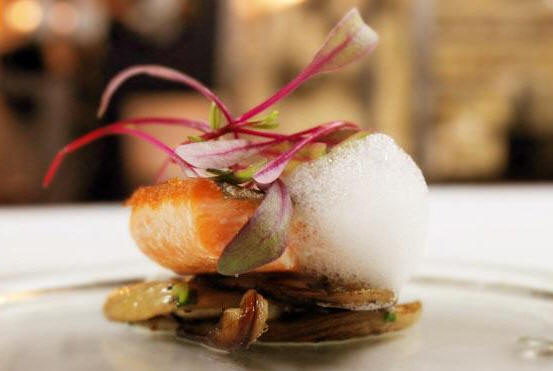 1. Poêler les salsifis à l’huile d’olive, finir au four.2. Sauter les champignons à feu vif dans l’huile d’olive, saler et ajouter les oignons verts et la ciboulette, réserver au chaud.3. Sortir du four après une belle coloration et ajouter le sirop d’érable, assaisonné avec du sel et les herbes fraîches, mettre de côté.4. Poêler les filets de truite du côté peau avec un peu d’huile d’olive à feu vif de 2-3 min., puis saler.5. Tourner les filets hors du feu et laisser dans la pôele pour finir la cuisson du poisson.6. Déposer dans les assiettes chacun des ingrédients en alternant de façon à superposer les divers éléments.7. Mixer avec un mixeur sur pied l’air à l’érable, puis ne récupérer que la mousse et la déposer délicatement sur la truite, décorer au goût.