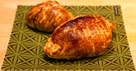 J’étends un autre morceau de pellicule plastique, sur lequel je dépose une feuille de pâte feuilletée (il faut préalablement la décongeler à la température pièce pendant une heure ou deux). J’y pose ma pièce de viande, et encore une fois je roule, en enlevant l’excédent de pâte, mais en m’assurant que la viande est complètement enveloppée de celle-ci.