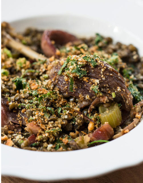 20 g (¾ oz) de cèpes (ou autres champignons) séchés 125 ml (½ tasse) de vin blanc, chaud 3 cuisses de canard confites 30 ml (2 c. à soupe) d’huile d’olive 115 g (4 oz) de bacon, coupé en lardons 1 gros oignon, coupé en fins quartiers 2 branches de céleri, tranchées 280 g (10 oz) de saucisson à l’ail ou kielbassa, coupé en rondelles 500 ml (2 tasses) de lentilles vertes du Puy sèches 1 litre (4 tasses) de bouillon de poulet 250 ml (1 tasse) de cresson effeuillé Chapelure assaisonnée 1 gousse d’ail, hachée finement 30 ml (2 c. à soupe) d’huile d’olive 125 ml (½ tasse) de chapelure 125 ml (½ tasse) de cresson, ciselé Sel et poivre