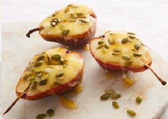 Retourner les moitiés de poires et garnir les cavités du fromage et des graines de citrouille.