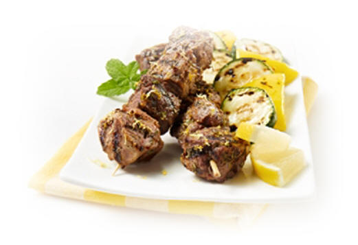 de citron râpé 30 ml (2 c. à soupe) de jus de citron 45 ml (3 c. à soupe) d’huile d’olive 15 ml (1 c. à soupe) d’ail, tranché en fines lamelles 15 ml (1 c. à soupe) de menthe fraîche, hachée 2,5 ml (1/2 c. à thé) de cumin moulu 2,5 ml (1/2 c. à thé) de piment d’Espelette 5 ml (1 c. à thé) d’herbes de Provence 600 g (1 1/4 lb) de gigot d’agneau, coupé en cubes de 3 cm